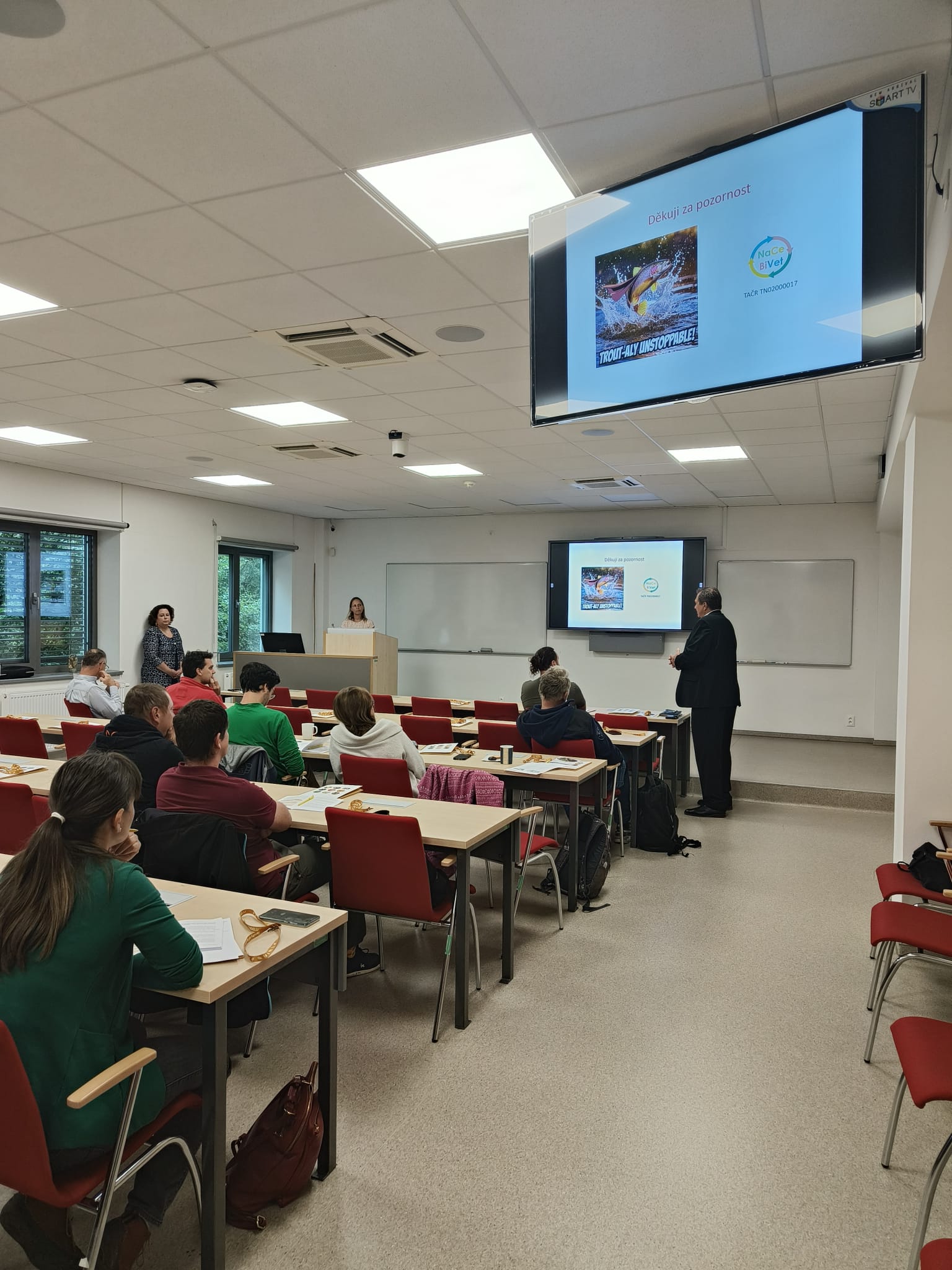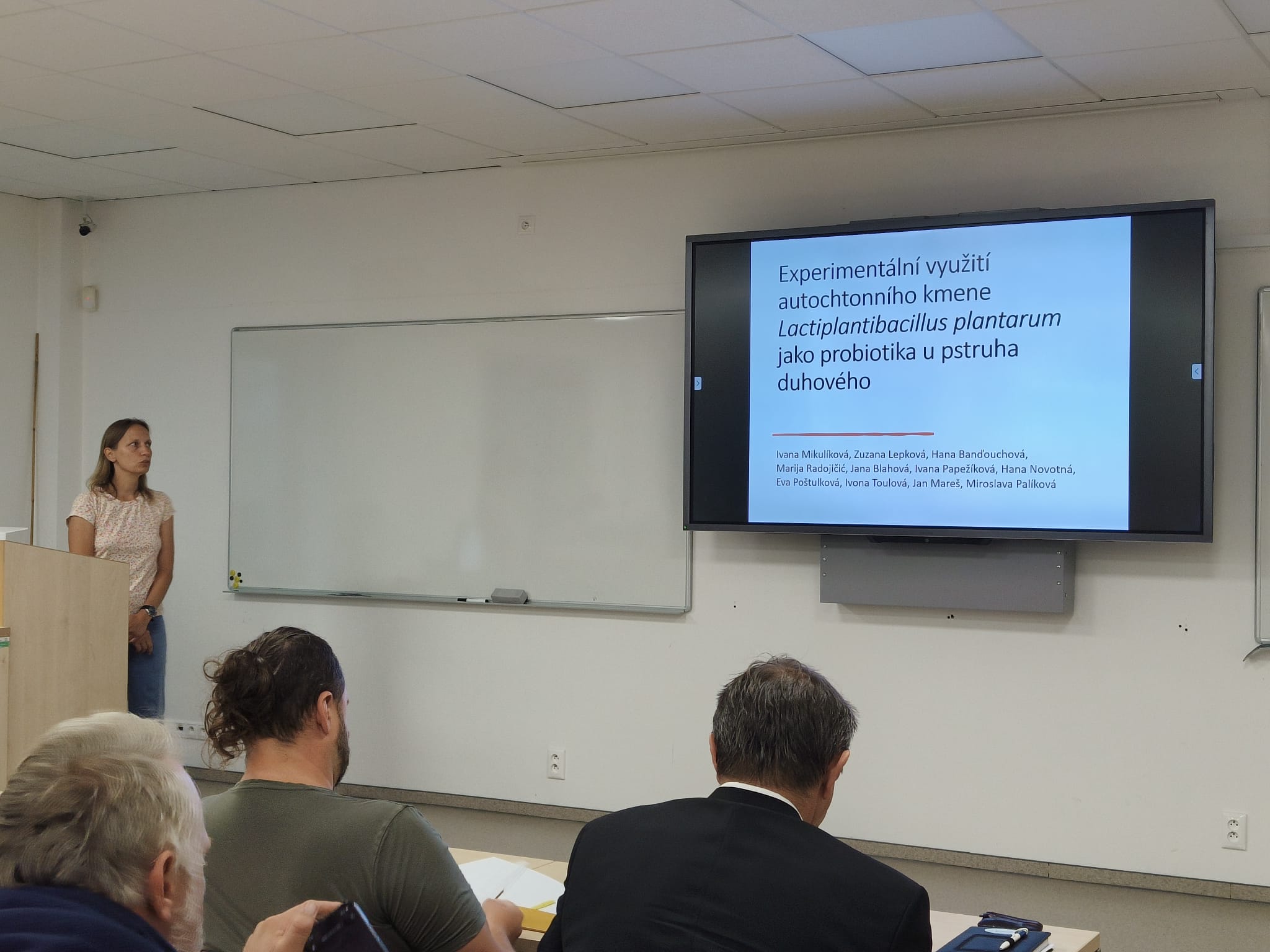 Úvodní příspěvek přednesla doktorka Machovcová ze společnosti Addicoo, která představila inovativní přístup k prevenci a léčbě onemocnění hospodářských zvířat bez použití antibiotik. Následovala doktorka Mikulíková, jejíž studie se zaměřila na experimentální využití autochtonního kmene Lactiplantibacillus plantarum jako probiotika u pstruha duhového (Oncorhynchus mykiss).